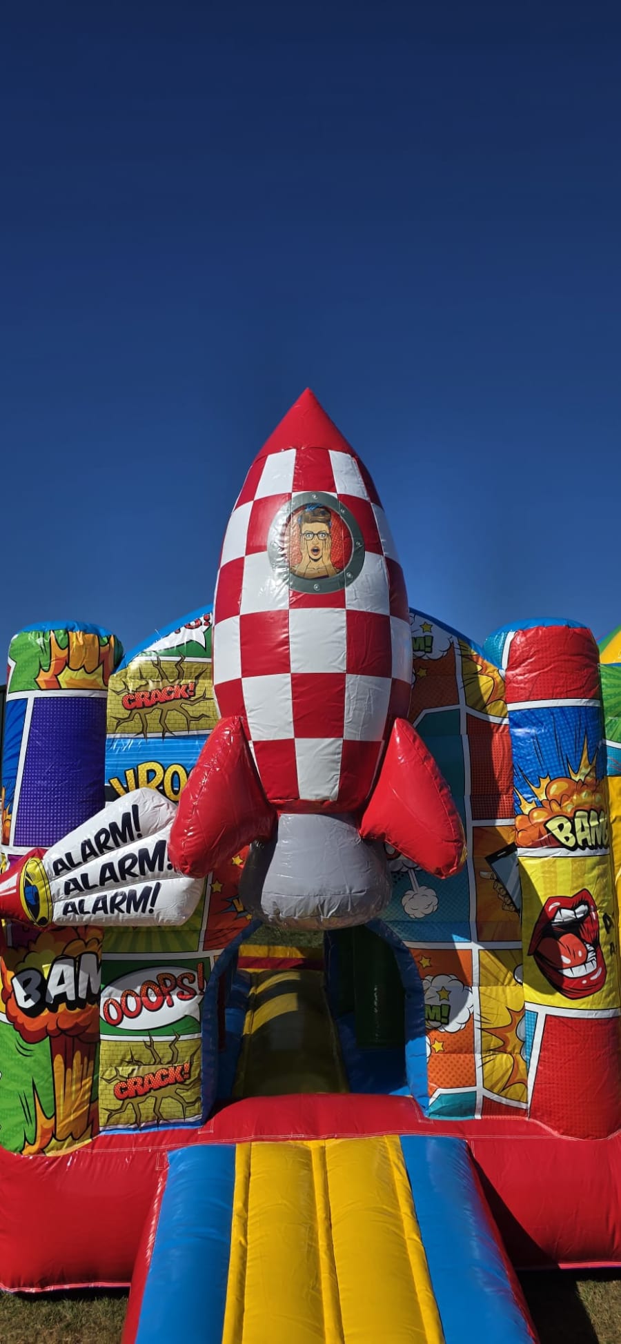 Bring laughter and action to any party with our Comic Multiplay Double Slide Combo. This comic multiplay unit combines a lively bouncy castle with a thrilling double slide. Bright comic prints, mega 3D rocket features, and comic strip icons create a playful scene that kids love. Perfect for birthdays, school fairs, and community events. 😄🚀