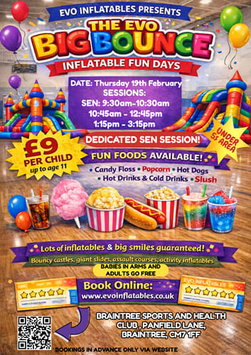 Perfect for the February Halfterm calendar, this event is easy to get to, brilliant for burning off wiggles, and an absolute winner for birthday squads or last-minute plans. Whether you’re searching for "the big evo bounce" or curious about a high-energy afternoon in Braintree , this is your go-to halfterm holiday experience.